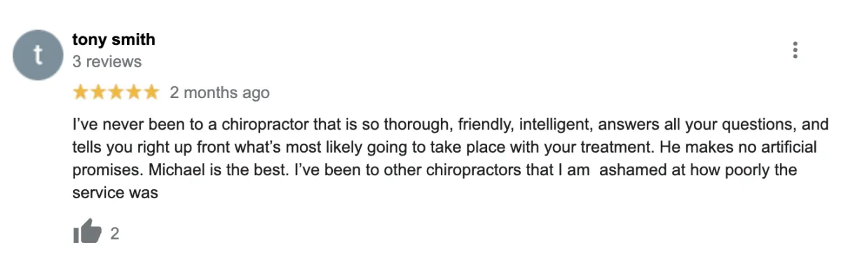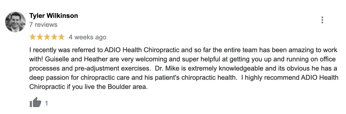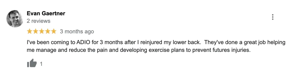 Disclaimer: Procedures and treatments performed by XXX - ADIO Health Chiropractic have an inherent success (and failure) rate. Reviews, testimonials and content on this site should not be interpreted as a statement of efficacy of procedures and treatments performed by XXX - ADIO Health Chiropractic for anyone else.